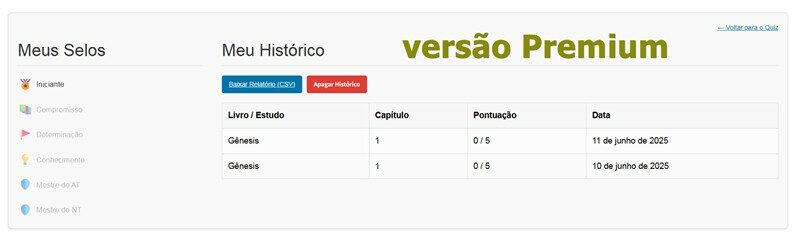 • Para usuários premium’s, o sistema salva automaticamente o resultado de cada quiz finalizado (livro, capítulo, pontuação e data).